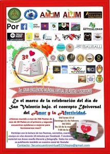 O 3º Encontro Mundial Virtual de Poetas e Escritores – Utopia Poética Universal, que conta com o apoio do Congresso Universal dos Escritores e demais organizações culturais, será realizado de segunda-feira, 15 a domingo, 21 de fevereiro de 2021, e visa reunir os maiores poetas do mundo.