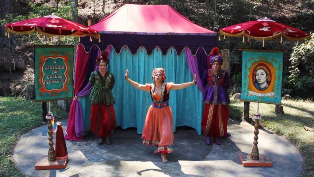 Em um minuto Ella se transforma em Camilly, a mensageira dos Deuses, em outro personifca a Pequena Flor, a menor mulher do mundo que é todo coração. Essas e outras personagens, além de dominarem a cena com a potência dos escritos de Clarice, também são as atrações do circo-teatro Los Lobos Bobos. Se para Clarice “viver é uma missão secreta”, o espetáculo O Mistério do Coelho Pensante nos revela que parte dessa missão é viver sempre com liberdade.6