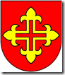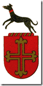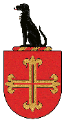 De vermelho, uma cruz de ouro florenciada e vazia. Timbre: um alão de negro, sentado, lampassado de vermelho.