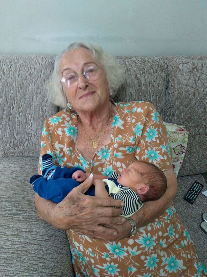 Minha mãe, Irma Pinhata, 92, trazendo no colo um dos bisnetos, Enrico