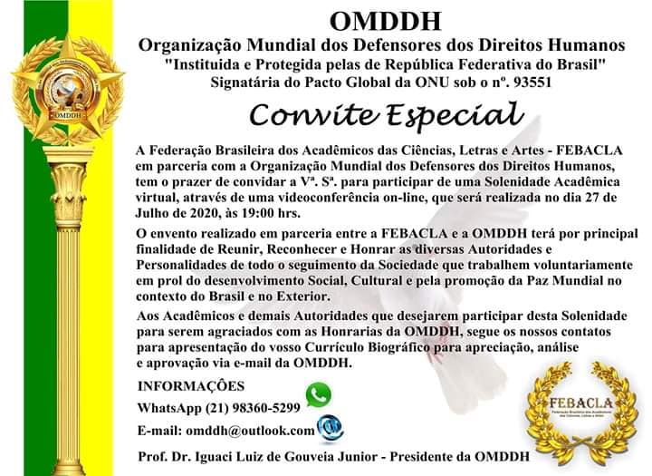 CONVITE ESPECIAL A TODOS OS NOSSOS AMIGOS PARA PARTICIPAREM DA SOLENIDADE ACADÊMICA ON-LINE, QUE SERÁ REALIZADA PELA FEDERAÇÃO BRASILEIRA DOS ACADÊMICOS DAS CIÊNCIAS, LETRAS E ARTES – FEBACLA EM PARCERIA COM A OMDDH
