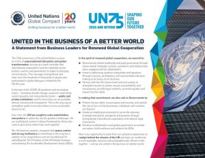 Lançado em 2000 pelo então secretário-geral das Nações Unidas, Kofi Annan, o Pacto Global é uma chamada para as empresas alinharem suas estratégias e operações a 10 princípios universais nas áreas de Direitos Humanos, Trabalho, Meio Ambiente e Anticorrupção e desenvolverem ações que contribuam para o enfrentamento dos desafios da sociedade. É hoje a maior iniciativa de sustentabilidade corporativa do mundo, com mais de 13 mil membros em quase 80 redes locais, que abrangem 160 países.