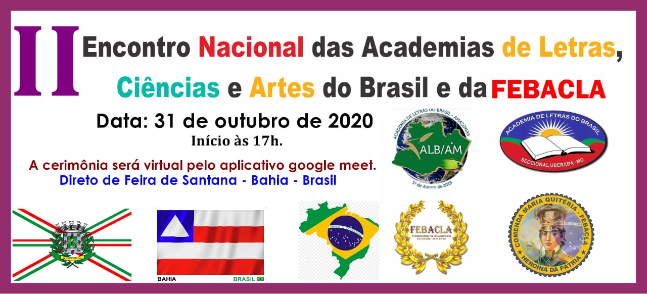 A outorga da COMENDA MARIA QUITÉRIA – HEROÍNA DA PÁTRIA será realizada no II ENCONTRO NACIONAL DAS ACADEMIAS DE LETRAS, CIÊNCIAS E ARTES DO BRASIL E DA FEDERAÇÃO BRASILEIRA DOS ACADÊMICOS DAS CIÊNCIAS, LETRAS E ARTES – FEBACLA