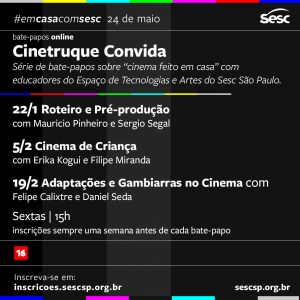 Cinetruque Convida é uma série de bate-papos sobre “cinema feito em casa” com educadores do Espaço de Tecnologias e Artes do Sesc São Paulo. O Sesc 24 de Maio convida educadores de outras unidades para compartilharem suas experiências em diversas áreas do audiovisual, traçando um paralelo com a sua ação educacional nos espaços em que atuam, dentro e fora do Sesc.