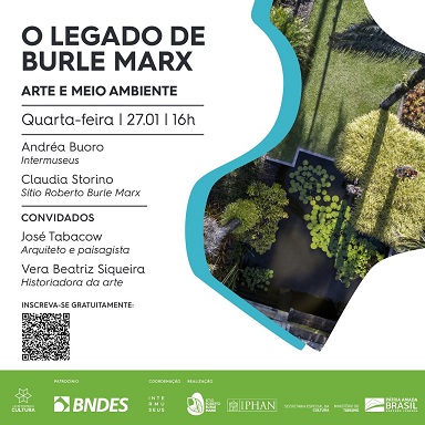A iniciativa é parte do Programa de Requalificação do Sítio Roberto Burle Marx, realizado com o gerenciamento da Intermuseus e com o patrocínio do Banco Nacional de Desenvolvimento Econômico e Social (BNDES), por meio da Lei de Incentivo à Cultura. A programação do webinar conta com a participação de quatro especialistas: Claudia Storino, Andréa Buoro, José Tabacow e Vera Beatriz Siqueira.