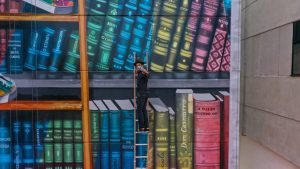 O mural mostra um menino subindo uma estante em uma biblioteca à procura de um livro