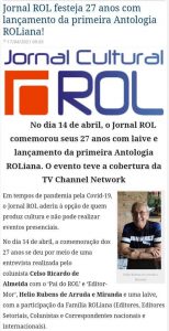 No dia 14 de abril do corrente ano, o nosso amado Helio Rubens nos presenteou com uma laive de lançamento da Antologia ROLiana- Antologia esta formada pelos colunistas do Jornal Rol, e pela qual eu tenho a honra de fazer parte e expor meus trabalhos literários, minhas ideias, curiosidades do planeta, História, Geografia e ciência em forma de pesquisas e crônicas.