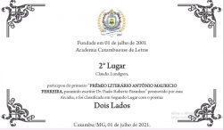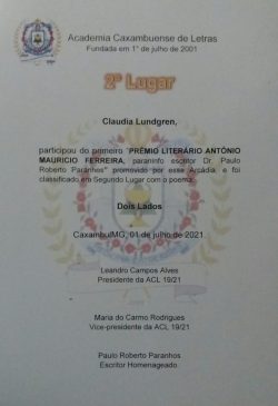 O resultado do I Prêmio Literário Antônio Maurício Ferreira, promovido pela Academia Caxambuense de Letras, foi divulgado hoje pela Tribuna do Sul de Minas. Fiquei muitíssimo feliz, pois conquistei, com o meu poema ‘Dois lados’, a segunda colocação.