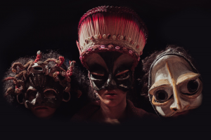 O figurino criado por Duda Viana funciona como uma segunda pele, obedecendo aos tons terrosos do cenário e fazendo uma alegoria das figuras a serem interpretadas. “Um elemento que liga a espacialidade e as vestimentas sāo as máscaras feitas por Cleydson Catarina, que representam as nossas vozes, as vozes das mulheres pretas desse Brasil e a das nossas ancestrais”, completa.