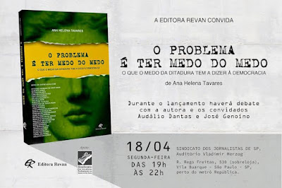 Não poderia ser mais emblemática a data do lançamento paulista de O problema é ter medo do medo (Editora Revan, 2016, 300p), da jornalista Ana Helena Tavares, um dia depois da pior derrota sofrida pela esquerda brasileira desde a redemocratização. Será nesta 2ª feira (18), a partir das 19h, no Sindicato dos Jornalistas de São Paulo (R. Rego Freitas, 530, sobreloja).
