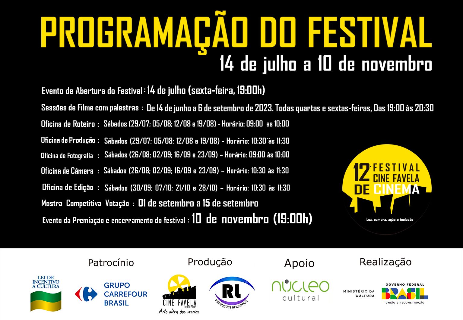 São Paulo, julho 2023 – A 12ª edição do FESTIVAL CINE FAVELA terá início na sexta-feira 14/07, às 19h, com abertura que acontece na sede da ONG de mesmo nome do evento, Rua do Pacificador, 288, em Hliópolis, zona Sul da capital paulistana.