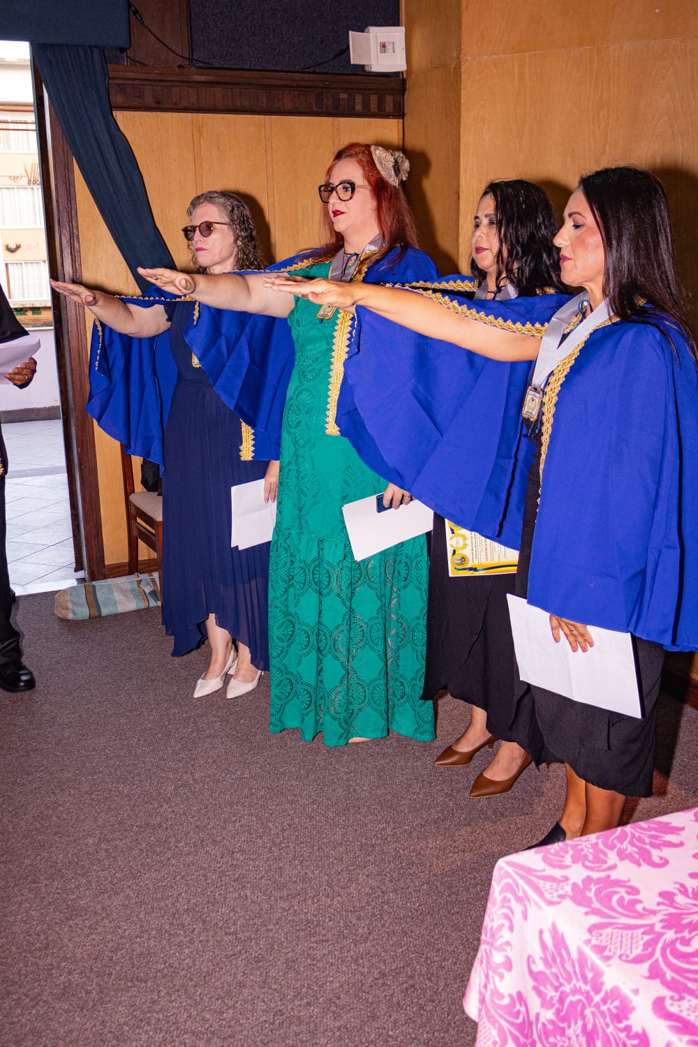 Juramento de posse das novas acadêmicas da Federação Brasileira dos Acadêmicos das Ciências, Letras e Artes – FEBACLA. Com o braço direito estendido, as empossadas reafirmaram seu compromisso com a ética, o conhecimento e a promoção das Ciências, Letras e Artes.