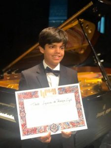 O pequeno pianista, apesar da pouca idade, já demonstra que será um colecionador de grandes prêmios. Em 2018, classificou-se em 1º Lugar no XVII Concurso de Piano ‘Souza Lima’ 2018, interpretando composições de Schumann (OP.68 – The Happy Farmer); Villa-Lobos (1,2 Angolinhas), Chopin (Valse – OP. 69, Nº 2), Kabalevsky (Variações On a Slovakian Folk Song).